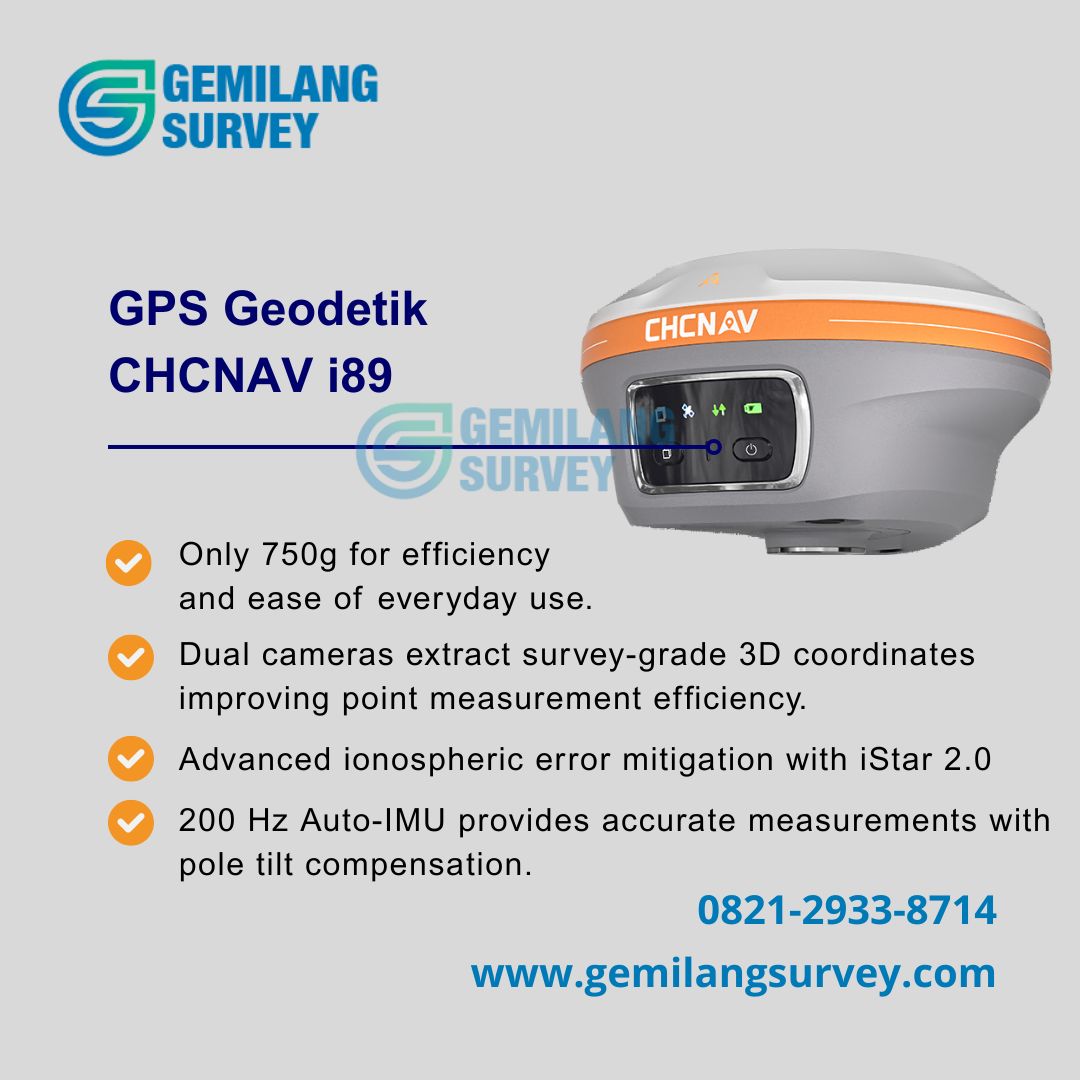 Nah, kenalin nih: GPS Geodetik CHCNAV i89, perangkat mungil seberat 750 gram yang punya otak canggih dan mata tajam. Gabungan dari GNSS, kamera HD, IMU otomatis, dan kemampuan visual surveying berbasis video.