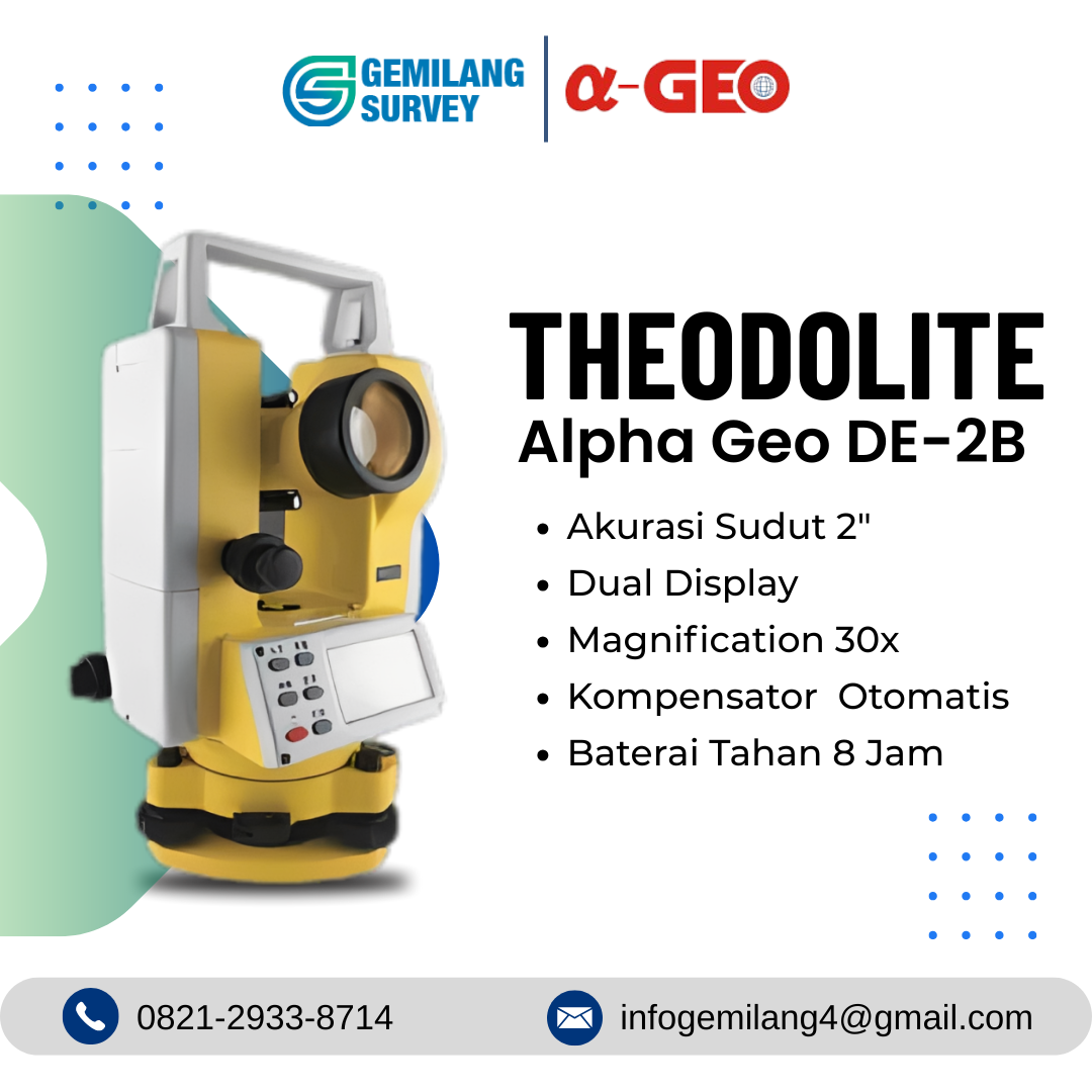 Perkenalkan, Theodolite Alpha Geo DE-2B adalah theodolite digital/elektronik yang dirancang untuk memberikan akurasi tinggi dan keandalan dalam berbagai aplikasi survei dan konstruksi. Dengan teknologi canggih dan desain ergonomis, alat ini memastikan pengukuran sudut yang presisi dan efisien.