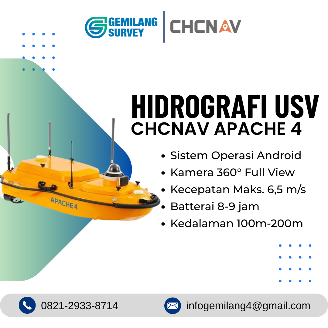 Jadikan USV CHCNAV Apache 4 sebagai pilihan utama untuk keperluan survei batimetri Anda. Produk ini tersedia di kategori USV kami. Untuk informasi lebih lanjut tentang produk unggulan lainnya, kunjungi Gemilang Survey.